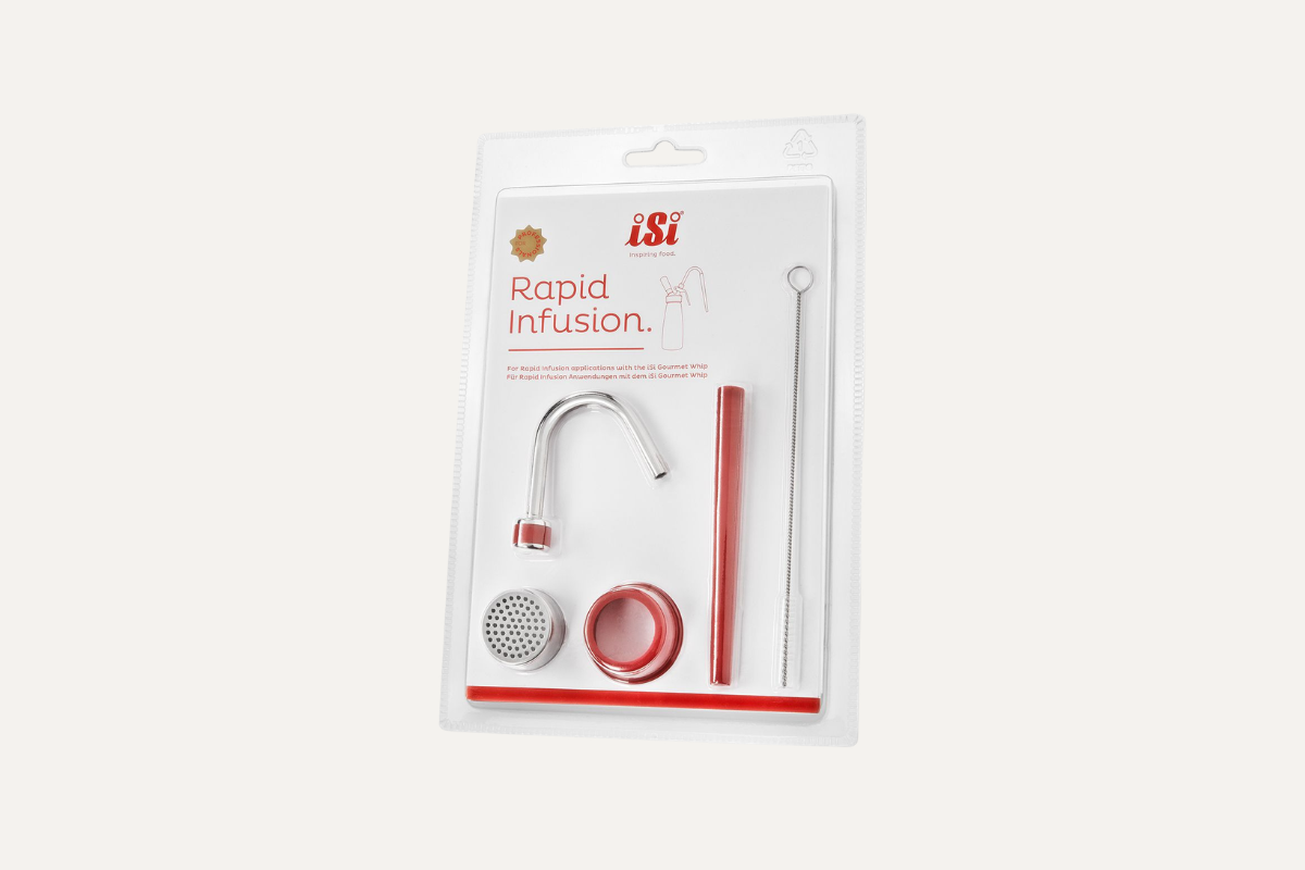 El procedimiento de Rapid Infusion permite la mezcla de un líquido con diferentes aromas en muy poco tiempo. Añada ingredientes aromáticos sólidos (como hierbas, especias, frutas) con algún líquido (como alcohol, aceite, agua o vinagre) en el sifón iSi. Mediante la presurización con la que se hace funcionar el sifón iSi con una cápsula iSi para nata, el aroma de los ingredientes se impregna con el líquido, confiriendo así un sabor único y especial.